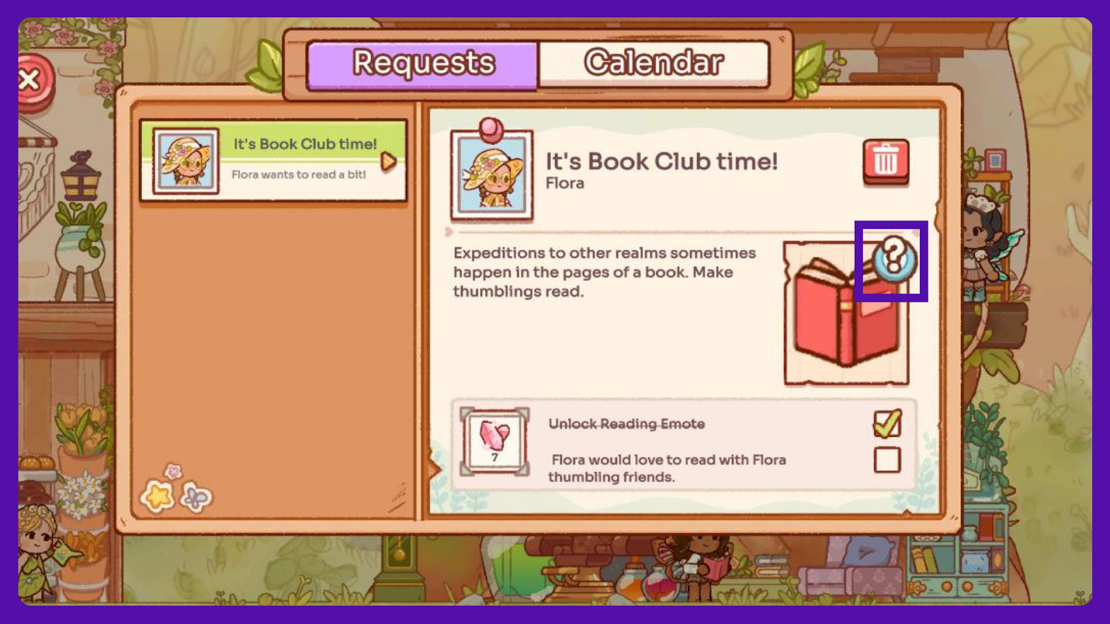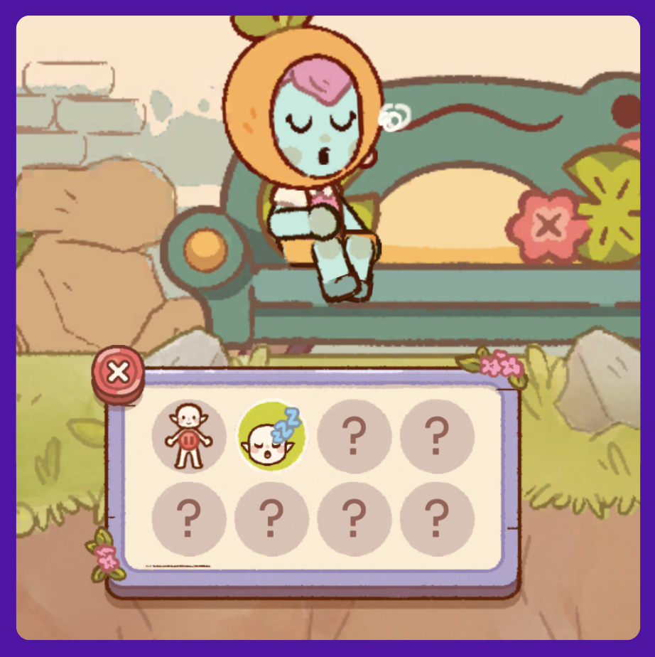 When your Thumbling has a request, a question mark will appear at the top of their head. Check all pending requests at the Notice Board. Press the ? to see how to complete each request.