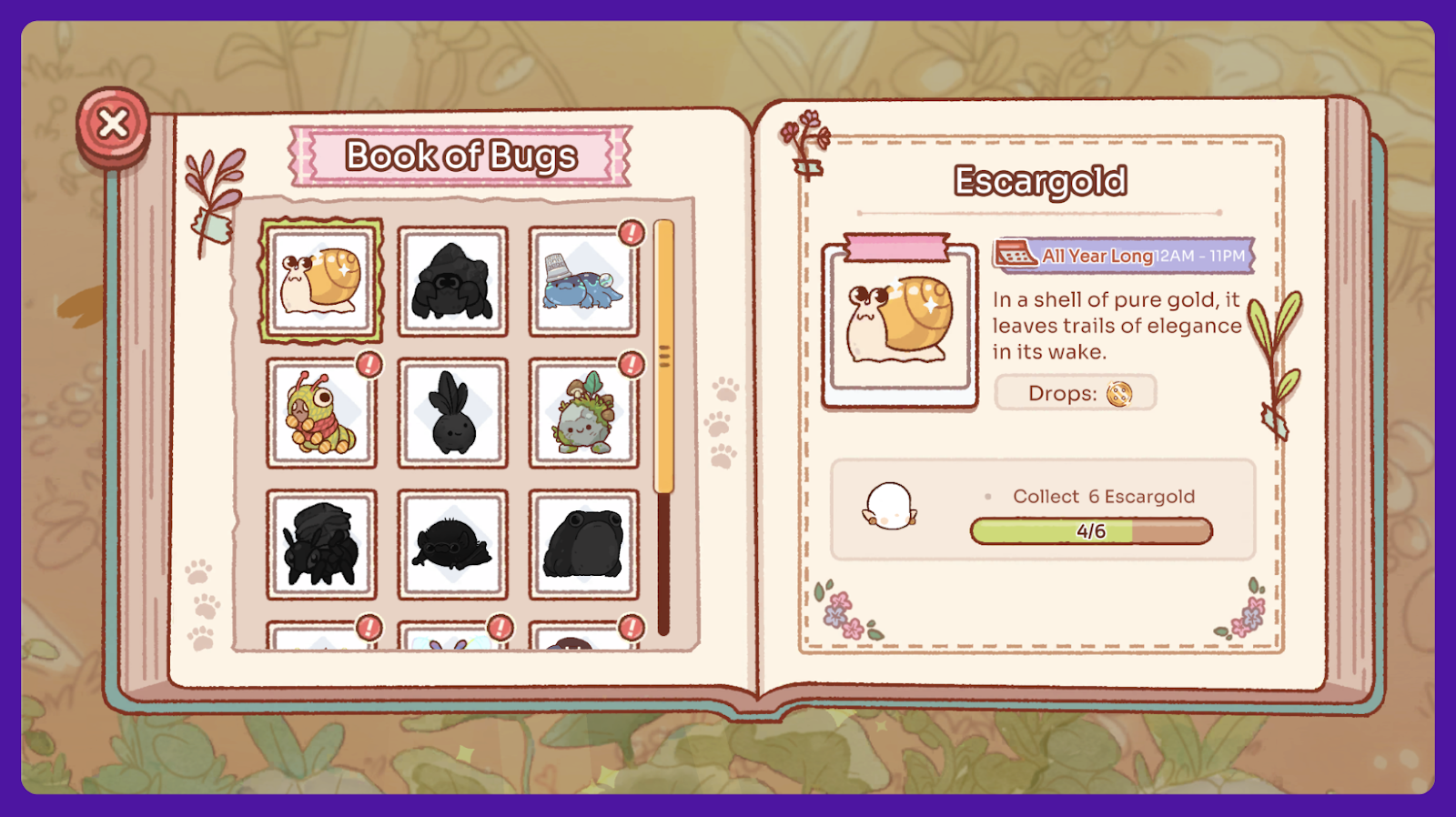 Go to the Book of Bugs on the main screen. You will be able to see the amount of Critters you’ve found as well as where to find the ones you’ve discovered.