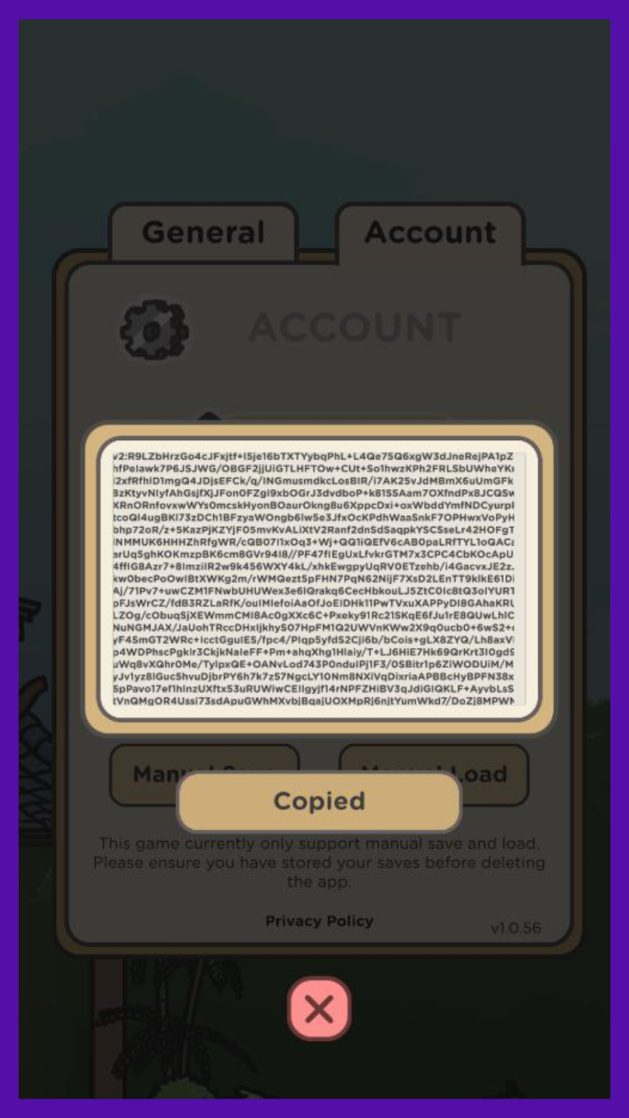 Our game has an internal save system. Your progress will save automatically in your game. To access this progress, you can export the code.